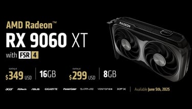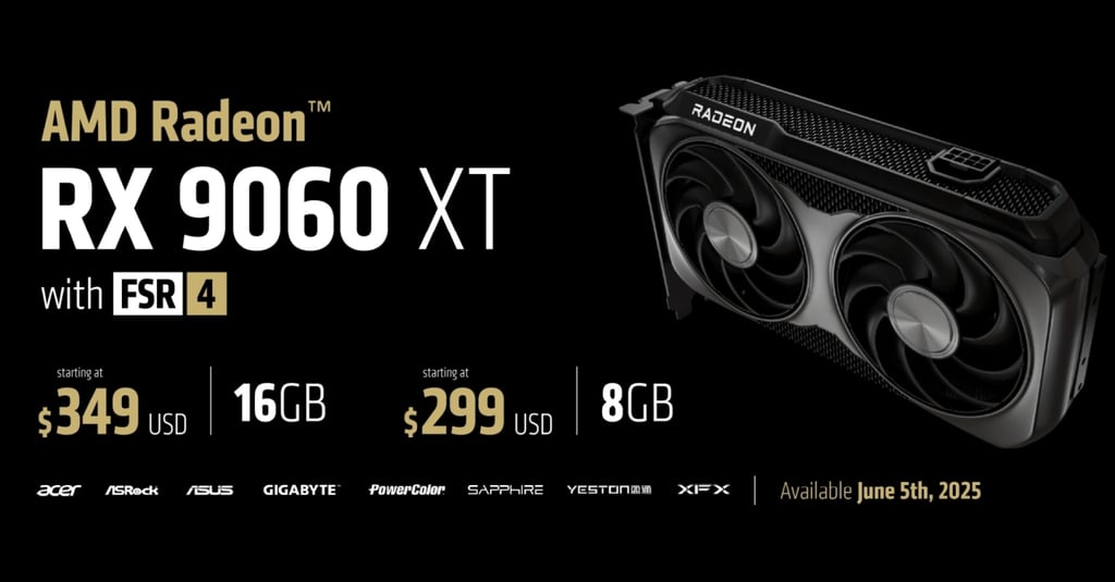 Côté prix, la Radeon RX 9060 XT 8 Go est affichée à 299 $, tandis que le modèle 16 Go sera proposé à 349 $. AMD précise que des modèles provenant de fabricants tels qu'Acer, ASRock, ASUS, GIGABYTE, PowerColor, Sapphire, Vastarmor, XFX et Yeston sont attendus.