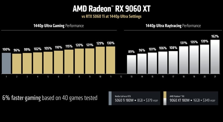 Si on en croit AMD, la RX 9060 XT 16 Go est un concurrent direct de la GeForce RTX 5060 Ti 8 Go, qui en dollars coûte 379 $. Les premiers benchs partagés par la marque montrent que la Radeon serait 6 % plus rapide dans plusieurs jeux (il n'est pas précisé quels jeux sont représentés).