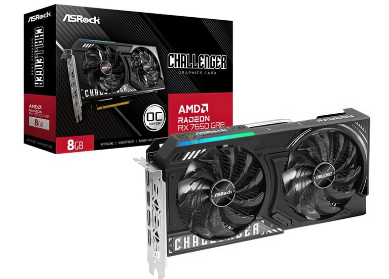 Sous le capot, la RX 7650 GRE embarque le GPU Navi 33 avec 32 unités de calcul et 2 048 processeurs de flux, accompagnés de 8 Go de mémoire GDDR6 à 18 Gbps. Sa consommation électrique est de 170 W, légèrement supérieure à celle de la RX 7600 (165 W), mais inférieure à la RX 7600 XT (190 W).