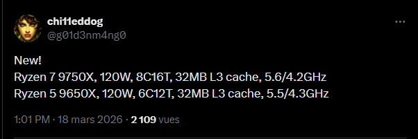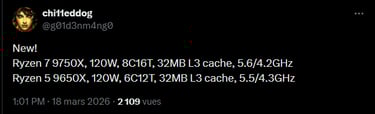 AMD pourrait bientôt lancer une mise à jour de sa gamme Ryzen 9000 basée sur l’architecture Zen 5 ! D’après une fuite, deux nouveaux modèles seraient en préparation : les Ryzen 7 9750X et Ryzen 5 9650X, avec un positionnement assez clair : plus de fréquence… et un TDP en nette hausse.