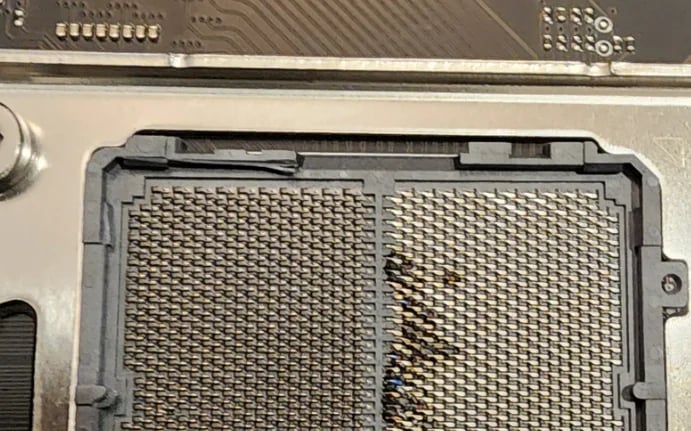 Dans ce cas précis, le socket semble visiblement endommagé, ce qui aurait pu empêcher une installation correcte du processeur. D'autres utilisateurs de Reddit ont avancé cette théorie, mais l'utilisateur lui-même reconnaît que la cause pourrait être aussi une erreur de manipulation.