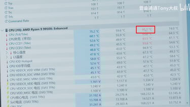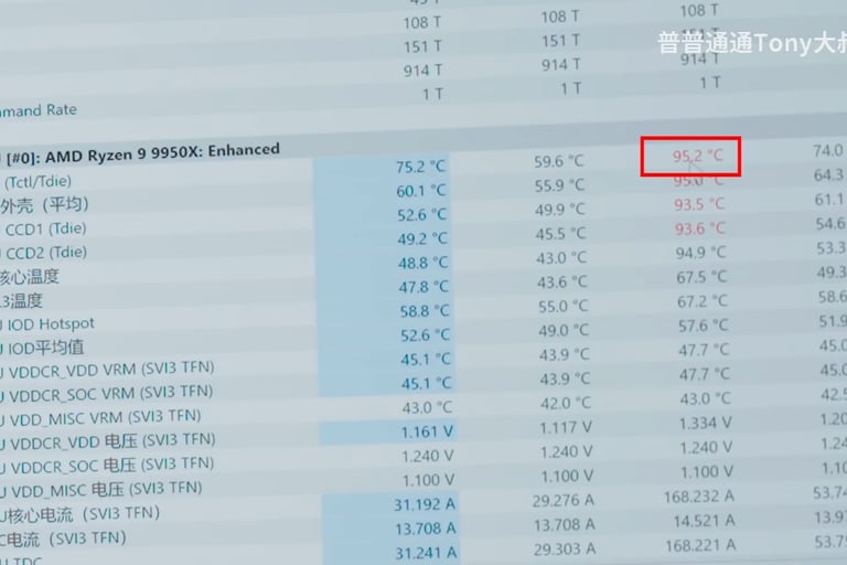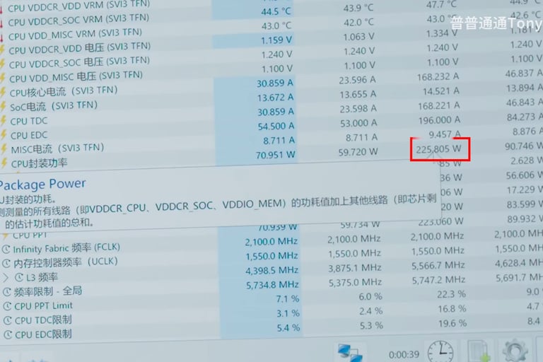 Le véritable attrait de cette vidéo réside dans la performance thermique ! Lors de la démonstration, le Ryzen 9 9950X, un processeur Zen 5 à 16 cœurs avec un TDP standard de 170 W, a atteint une consommation maximale de 225,8 W tout en maintenant une température stable de 95,2 °C !
