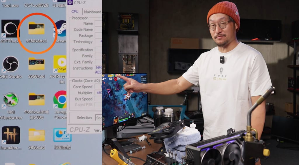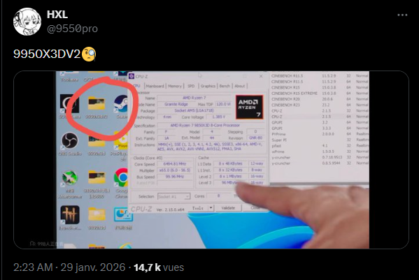Dans une vidéo publiée récemment par Tony Yu, directeur général d’ASUS Chine, on peut apercevoir sur le bureau de son PC un dossier intitulé “9950x3dv2”. La vidéo portait pourtant sur les performances en overclocking du Ryzen 7 9850X3D, mais ce détail visuel laisse peu de doute : ASUS travaille déjà sur le Ryzen 9 9950X3D2 !