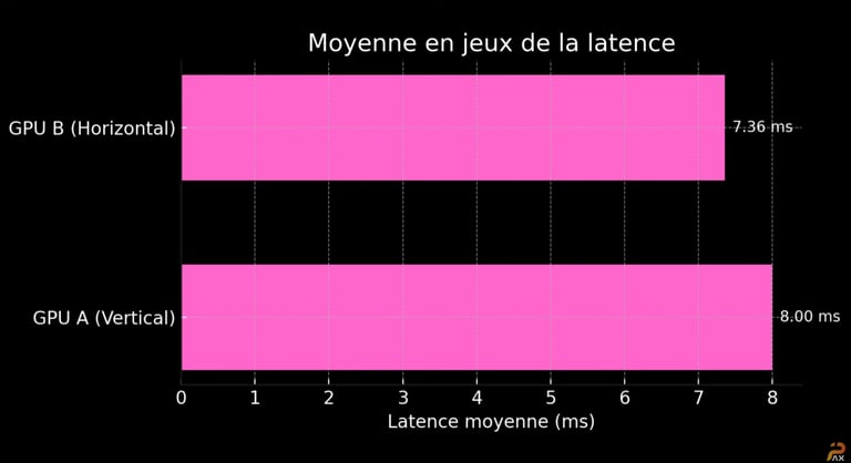Sur la latence, PAX note bien un écart d’environ 8 % en défaveur du montage vertical. Un chiffre qui paraît important sur le papier, mais qui reste sous les 10 ms, donc imperceptible pour la majorité des joueurs. À moins d’être un compétiteur e-sport ultra-pointilleux, cet impact ne change strictement rien en jeu.