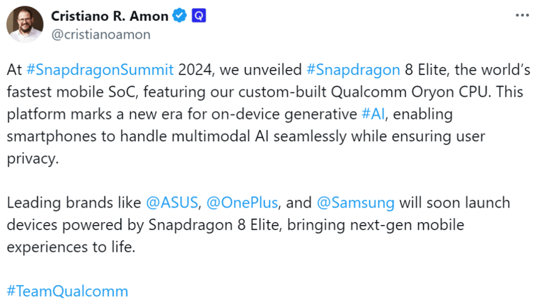 "ARM continue de nous répéter les mêmes menaces infondées destinées à faire pression sur un partenaire de longue date, à interférer avec nos processeurs les plus performants et à augmenter les taux de redevances sans tenir compte des droits étendus garantis par notre licence d'architecture. Alors qu'un procès approche à grands pas en décembre, le stratagème désespéré d'Arm semble être une tentative de perturber le processus juridique, et sa demande de résiliation est totalement infondée. Nous sommes convaincus que les droits de Qualcomm en vertu de son accord avec Arm seront confirmés. Le comportement anticoncurrentiel d'Arm ne sera pas toléré" — Qualcomm