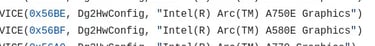 L'identifiant PCI 0x56BE semble correspondre à l'Arc A750E, tandis que 0x56BF semble correspondre à l'Arc A580E.