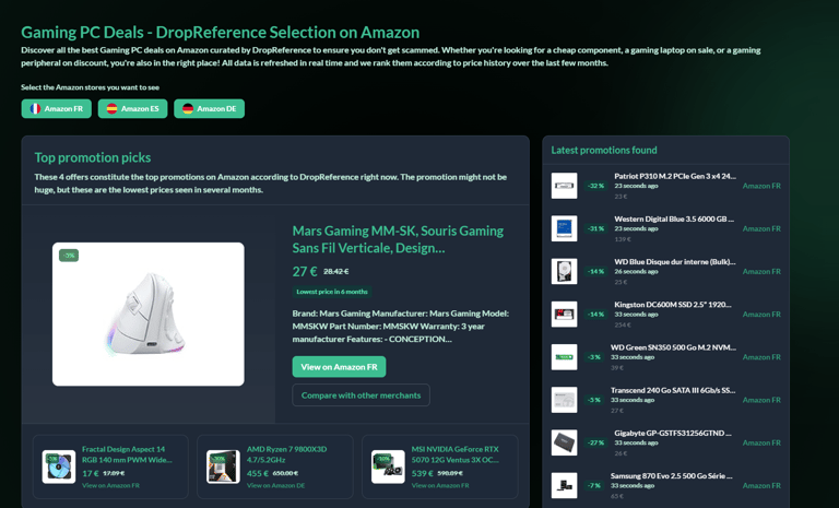 Aujourd’hui, DropReference permet de suivre et comparer les prix d’une large gamme de produits : composants PC (GPU, CPU, RAM, alimentations…), périphériques gaming, écrans, PC montés et portables. Les prix sont actualisés en temps réel, avec un historique et des filtres pour affiner les recherches.