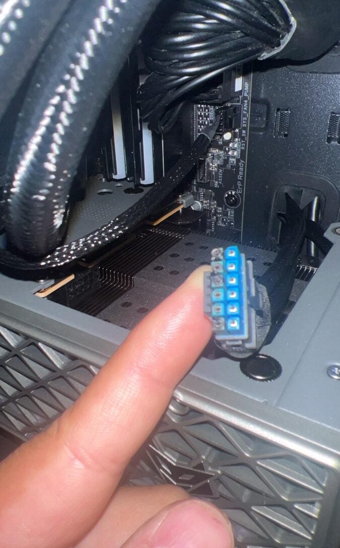 L’utilisateur, qui utilisait l’adaptateur fourni (celui à embout bleu) avec une Corsair RM1000X, a remarqué plusieurs broches brûlées.