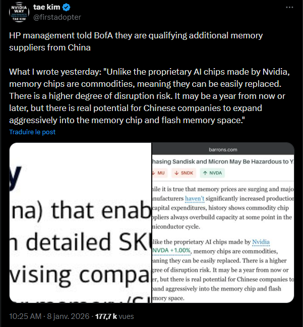D’après l’analyste Tae Kim (Barron’s), HP serait désormais contrainte d’explorer d’autres pistes, dont l’achat de mémoire DRAM auprès de fabricants chinois comme CXMT.