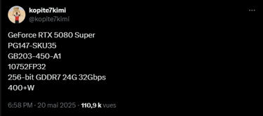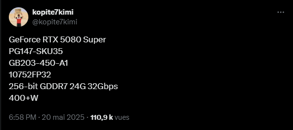 Les spécifications de la RTX 5080 SUPER ont fuité, avec 24 Go de GDDR7 et une bande passante de 32 Gbps.