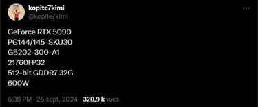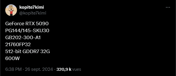 En effet, selon Kopite7kimi , la RTX 5090 serait désormais dotée d'un bus mémoire de 512 bits (et non de 448 bits comme mentionné précédemment) et proposera 32 Go de mémoire GDDR7.