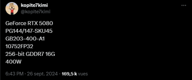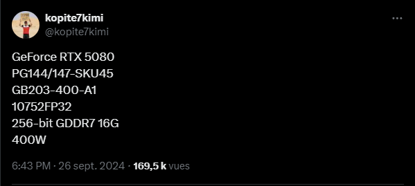 La RTX 5080 serait basée sur un GPU GB203-400 doté de 10752 cœurs CUDA, elle disposerait d'un bus mémoire de 256 bits et de 16 Go de mémoire GDDR7. La consommation d’énergie serait supérieure à celle de la RTX 4080, dépassant les 320 W.