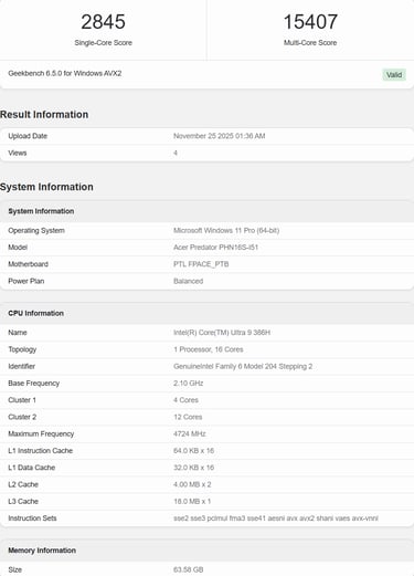 Le 386H a été repéré dans un prototype d’Acer Predator Helios, équipé de 64 Go de RAM et d’une configuration proche d’un produit final. Contrairement aux précédents tests sur des engineering samples, celui-ci fonctionnerait à des fréquences quasi retail : entre 4,6 et 4,7 GHz pendant les runs Geekbench.