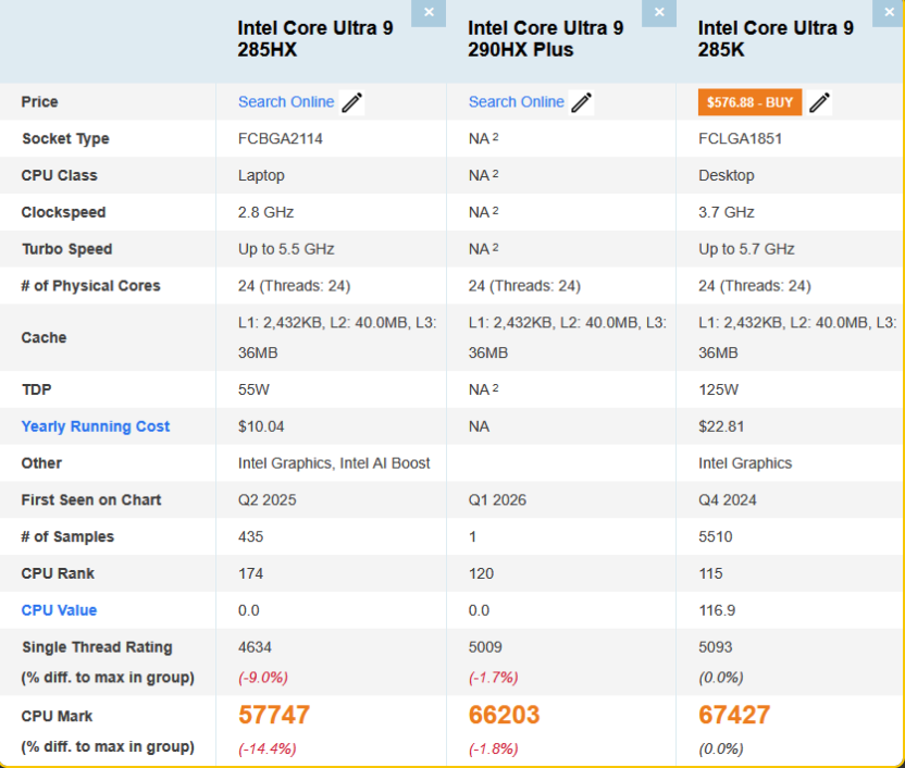 Un premier benchmark PassMark montre que la nouvelle puce mobile Arrow Lake Refresh talonne le 285K et surpasse le 285HX
