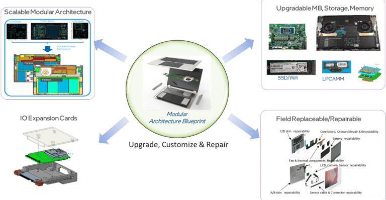 Intel propose une architecture modulaire pour rendre les PC plus durables, en facilitant réparations et mises à niveau à tous les niveaux, des usines aux utilisateurs.