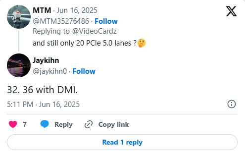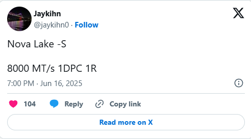 Alors que les processeurs actuels Arrow Lake-S prennent en charge la DDR5-6400 et peuvent atteindre 9200 MT/s en overclocking, les processeurs Nova Lake-S offriraient des vitesses de 8000 MT/s en natif.