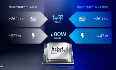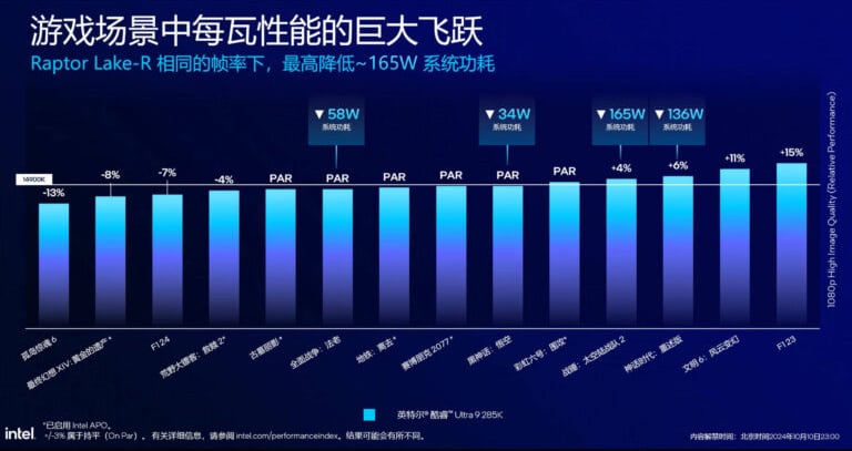 D’autres informations montrent que le Core Ultra 9 285K atteint des performances comparables au Raptor Lake-R (Refresh), tout en réduisant la consommation de près de 165 W dans certains jeux.