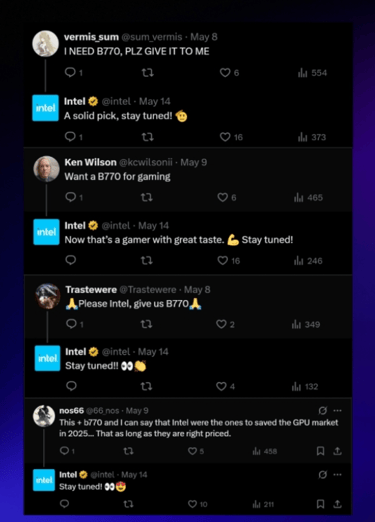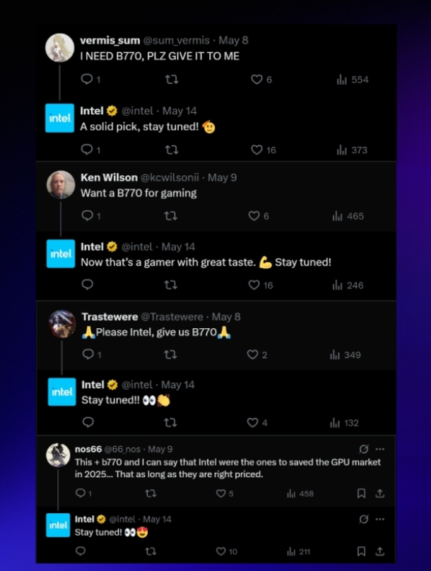 Jusqu’ici, on ne savait pas si cette carte allait réellement voir le jour. Le dernier teaser d’Intel, centré sur des cartes Arc Pro pour stations de travail et IA, laissait planer le doute. Mais depuis quelques jours, Intel répond directement aux curieux sur les réseaux sociaux, et toujours avec la même formule : « Stay tuned! ».