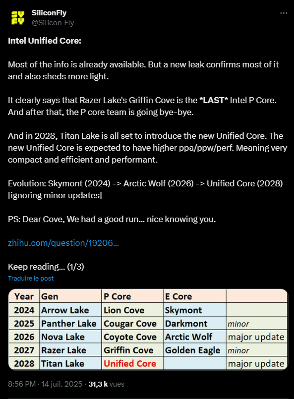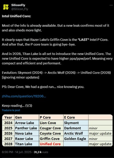 Dans un nouveau post de @SiliconFly sur X, on apprend que les prochains CPU Titan Lake et leur nouvelle architecture Griffin Cove seraient les derniers processeurs Intel à utiliser des P‑Cores et en 2028, Titan Lake devrait introduire le nouveau Unified Core.