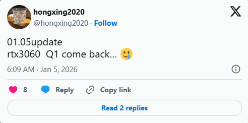 L’information vient de @hongxing2020, souvent bien informé sur les plans de production NVIDIA. La marque aurait confirmé à ses partenaires que la RTX 3060 reviendrait en magasin dans les prochains mois, sans préciser encore si les deux variantes (12 Go et 8 Go) seraient concernées.