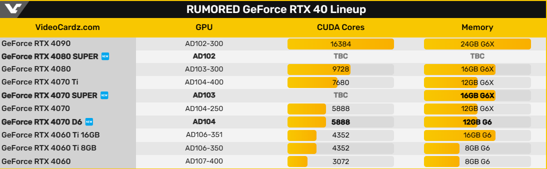Selon la rumeur, la NVIDIA GeForce RTX 4070 SUPER serait équipée du GPU AD103. Cela signifie que la RTX 4070 Ti SUPER pourrait également être équipée de ce même processeur ou passer au processeur AD102 haut de gamme. La carte existante est basée sur le GPU AD104-250. Le passage au GPU AD103 est nécessaire pour élargir la largeur du bus mémoire, car les modèles RTX 4070 actuels sont limités par le bus de 192 bits du GPU AD104.