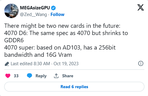 Auparavant, MEGAsizeGPU avait annoncé qu'une mise à jour de la RTX 4080 était prévue, sous la forme d'une variante Ti ou SUPER, avec des spécifications améliorées mettant en vedette le GPU AD102. On s'attend à ce que cette carte mise à jour conserve le prix d'origine de la RTX 4080, suggérant la possibilité d'une réduction de prix pour le modèle de base dans un avenir proche.