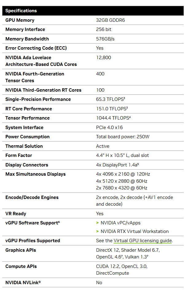 En ce qui concerne la bande passante mémoire, ainsi qu'une vitesse mémoire légèrement inférieure de 18 Gbps, on constate une réduction notable par rapport au 6000 ADA, passant de 960 à 576 Go/s. De plus, les "Single-Precision Performance" chutent de 91 à 65 TFLOPs. La performance en simple précision mesure la vitesse à laquelle un composant peut effectuer des opérations mathématiques sur des nombres à virgule flottante en simple précision (32 bits).