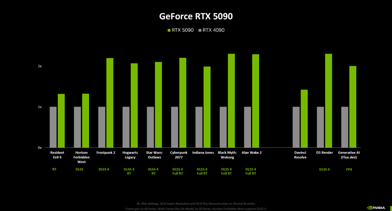 En attendant jeudi, NVIDIA a présenté des benchmarks pour les modèles RTX 5090, 5080, 5070 Ti et 5070, testés sur deux jeux : Resident Evil 4 (avec ray tracing mais sans DLSS) et Horizon Forbidden West (sans ray tracing, utilisant DLSS Super Resolution mais sans DLSS MFG).