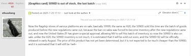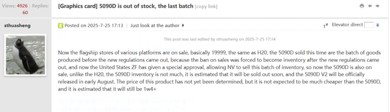 Côté disponibilité, la RTX 5090 D est désormais difficile à trouver. Selon un post publié sur Chiphell, les unités encore en vente seraient issues d’une production antérieure aux nouvelles régulations, et NVIDIA aurait obtenu une autorisation spéciale pour les écouler. Ces stocks devraient s’épuiser rapidement, laissant la place à la version V2.