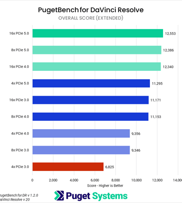 Les tests ont commencé avec After Effects, où la RTX 5090 perd une bonne partie de ses performances en passant d’un slot PCIe 5.0 x16 à un slot PCIe 3.0 x4, avec plus de 10 % de perte. Même constat avec DaVinci Resolve, où la perte dépasse les 20 % dans une configuration en PCIe 3.0 x4. Des pertes sont également observées lorsque le nombre de lignes est réduit dans un slot PCIe Gen5.