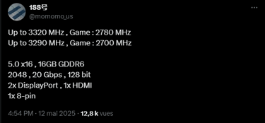 AMD pourrait éviter l'erreur de NVIDIA avec la RTX 5060 8 Go en proposant sa RX 9060 XT avec 16 lignes PCIe 5.0 et des fréquences allant jusqu'à 3,3 GHz. Deux versions seraient prévues : 8 Go et 16 Go, pour un lancement dès la mi-mai.