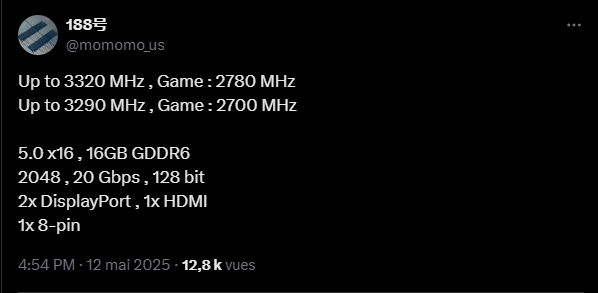 Selon le leaker @momomo_us, la RX 9060 XT atteindrait une fréquence boost d’environ 3,3 GHz, avec des fréquences en jeu tournant autour de 2,7 à 2,8 GHz. C’est nettement plus élevé que les RX 9070 classiques, qui se contentent d’environ 2,5 GHz. Cela confirme les rumeurs précédentes selon lesquelles AMD miserait sur des fréquences élevées pour ce modèle milieu de gamme.