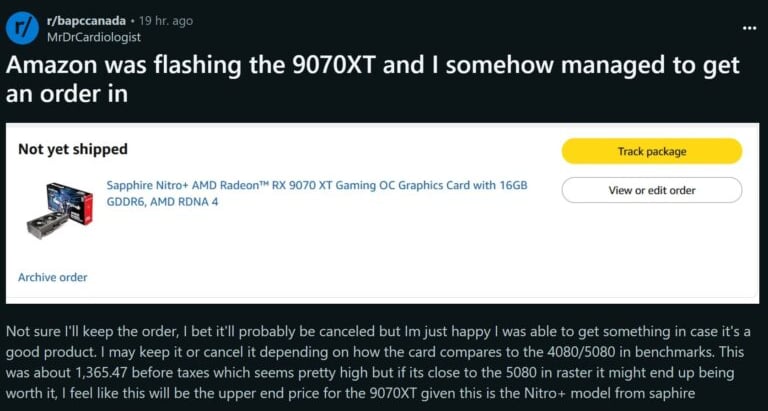 C’est un utilisateur du forum Reddit qui l’a repérée et confirmé que sa commande est bien en attente d’expédition. Techniquement, cela fait de lui le premier propriétaire connu d’une RX 9070 XT (hors testeurs).
