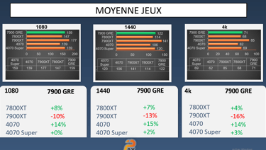 En moyenne (cela reste une moyenne sur nos 8 jeux testés et des différences notables peuvent apparaître selon les jeux, certains jeux étant plus "gourmands" que d'autres), la 7900 GRE est plus performante de 14% que la 4070 en 1080p, de 15% en 1440p et de 14% en 4K. Nous pouvons donc constater que la carte tient ses promesses par rapport à la RTX 4070.