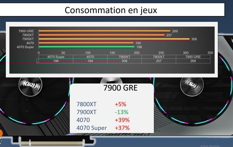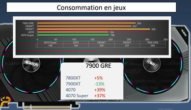 Par rapport aux cartes 7800XT et 7900XT, la 7900 GRE se situe entre les deux puisqu'elle consomme 5% de plus que la 7800XT et 13% de moins que la 7900XT, ce qui est logique par rapport aux performances de chacune de ces cartes.