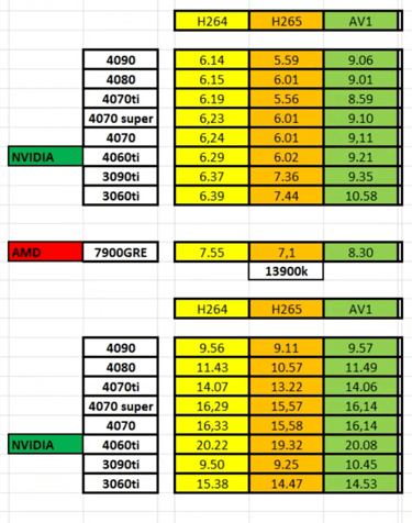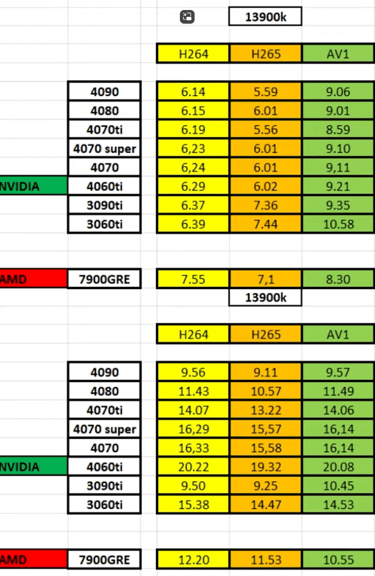On peut voir dans les résultats que cette 7900 GRE s'en sort plutôt bien : sans effet, en AV1, elle s'en sort même mieux que toutes les autres cartes de NVIDIA.