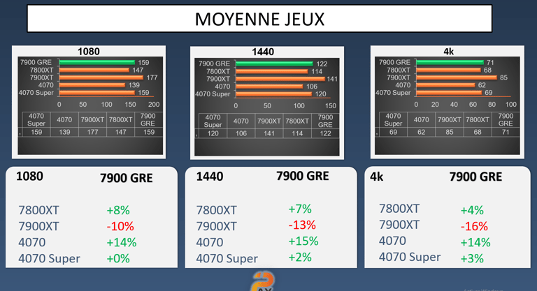 Selon les jeux et leurs exigences respectives, les performances peuvent varier, mais la RX 7900 GRE s'est toujours montrée plus performante que la RTX 4070, allant de 6 à 20% plus perf' en 1080p, de 5 à 22% plus perf' en 1440p et de 4 à 27% plus perf' en 4K.