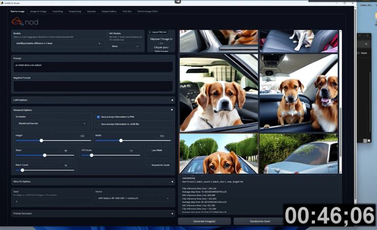 Concernant la génération d'images 512x512, nous avons fait le test de demander une image de "un chien dans une voiture" sur Stable Diffusion et le temps de réponse a été de 4"05. Pour la génération de 10 images, le temps est monté à 46"06. Cela reste de bons résultats, même si en moyenne, Nvidia s'en sort mieux pour ce type d'exercice.