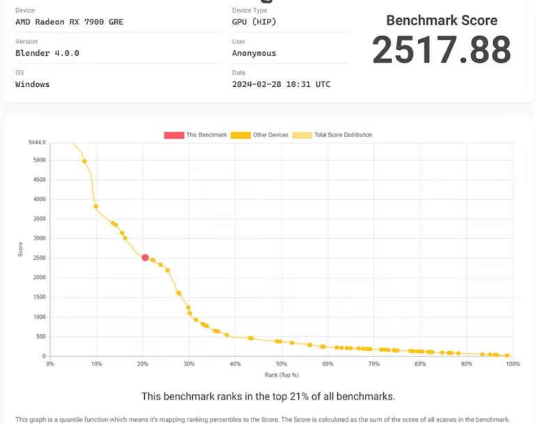 L'Atelier a testé la carte sur BLENDER en version 4. Nous obtenons un score de 2517,88, qui est un score honorable pour cette catégorie de carte.