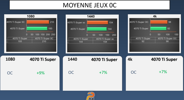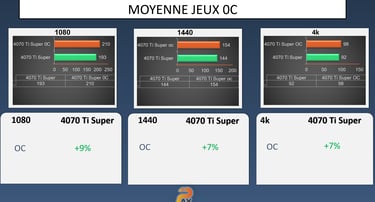 En terme d'overclocking, l'Atelier a réussi à obtenir des améliorations de perf' sur les 10 jeux testés de l'ordre de 9% en 1080p, de 7% en 1440p et de 7% en 4K.