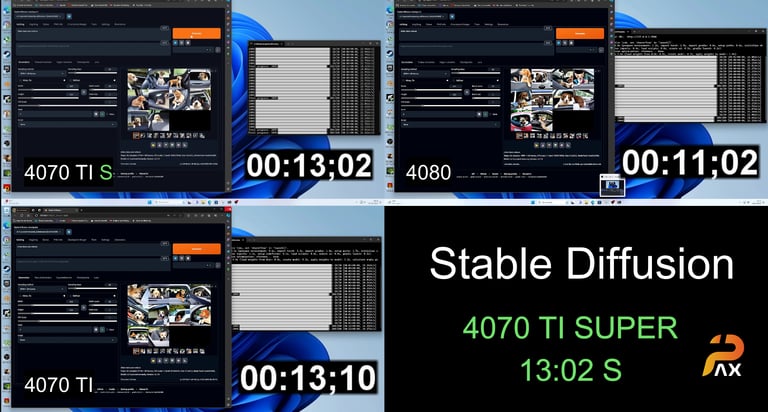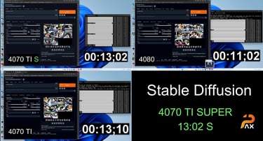 L'Atelier a comparé les résultats entre la RTX 4070 TI, la RTX 4070 Ti Super et la RTX 4080 pour la génération d'images 512x512 par IA avec le prompt "un chien dans une voiture" sur le logiciel "Stable Diffusion". Sur un rendu de 10 images, la 4080 est plus rapide avec un temps de rendu de 11"02, suivi par la 4070 Ti Super avec un temps de 13"02 et enfin la 4070 Ti avec un temps de 13"10. C'est malgré tout un très bon résultat, mais en dessous de la 4080 dans ce domaine. Ce résultat s'explique par la différence du nombre de tensor cores, plus élevé sur la 4080.