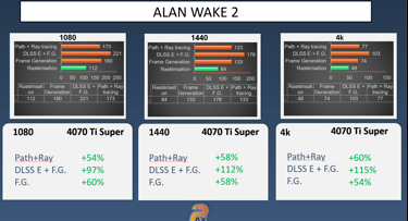 L'Atelier a testé sur le jeu "Alan Wake 2" les technologies de Path Tracing, de Ray Tracing, de Frame Generation, et même de Frame Generation associée au DLSS, et voici les résultats sur les performances :