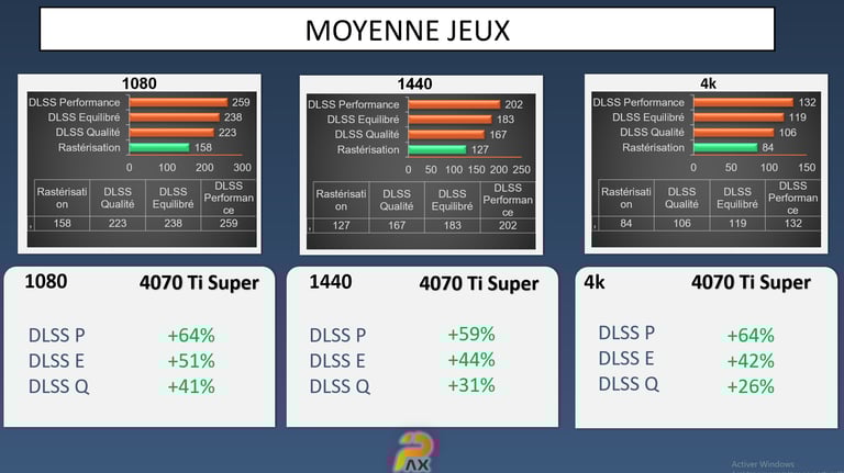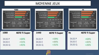 L'Atelier a testé 3 jeux en activant le DLSS : Cyberpunk 2077, Starfield et Forza Horizon. Nous avons testé les modes Qualité, Equilibre et Performance en mode Ultra. Sur CyberPunk par exemple, un jeu exigeant, les résultats sont bons, puisqu'en 4K, la 4070 Ti Super peut obtenir 91 FPS en jeu en utilisant le DLSS Equilibré. Sur Forza Horizon, les résultats sont moins impressionnants, mais sur Starfield, l'augmentation permet d'obtenir 112 FPS en mode Equilibré en 4K. En moyenne, il a toujours un gap en utilisant les DLSS, mais vous pourrez remarquer qu'il est plus ou moins important selon les jeux !