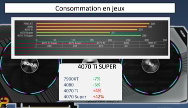 Si la 4070 Ti Super est plus performante que le modèle de base 4070 Ti, sa consommation est aussi plus élevée : on note 4% de conso en plus, cela n'est pas énorme puisqu'on approche les 10% de perf' en plus en 4K.