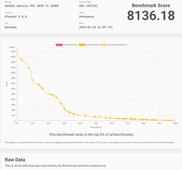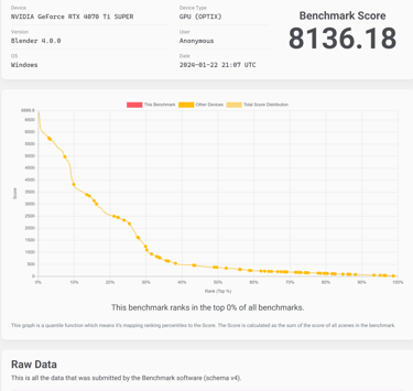 L'Atelier a testé la carte sur BLENDER en version 4. Nous obtenons un score de 8136,18, c'est-à-dire une différence de 23% avec le score de la 4070 Ti classique, mais qui reste encore 7% moins haut que la 4080. La différence est due clairement à la différence de cœurs CUDA entre la 4070 Ti Super et la 4080.