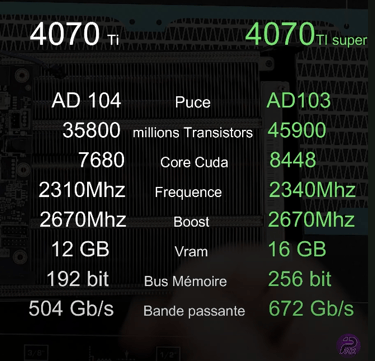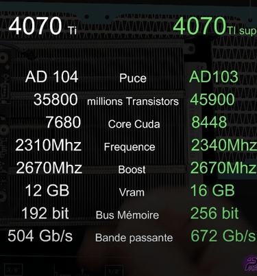 Il y a une vraie mise à niveau entre la 4070 Ti et cette 4070 Ti Super : la principale différence est que le processeur est désormais un AD103 comme sur la 4080, et non plus un AD104 ! Par conséquent, le nombre de transistors passe de 35800 millions à 45900 millions, soit une augmentation de 28%. Il y a une augmentation du nombre de cœurs CUDA de 10%, passant de 7680 à 8448. Du fait d'avoir changé la puce, la VRAM est désormais de 16GB à la place des 12GB sur l'ancien modèle ainsi qu'un bus mémoire élargi à 256 bits ! La bande passante augmente de 504 Gb/s à 672 Gb/s. On se rapproche ici presque d'une 4080 en terme de VRAM et de puce !