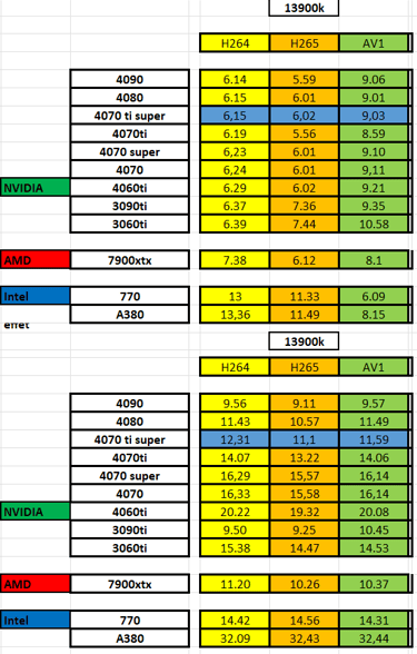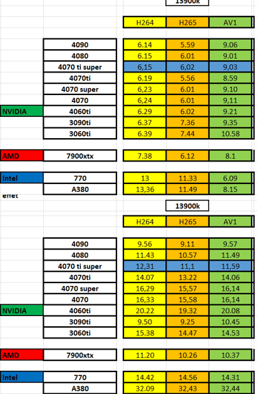 Sur ADOBE PREMIERE ainsi que sur DAVINCI RESOLVE, l'Atelier a testé la carte sur un fichier ProRes de plus de 100 Go, sans, puis avec une multitude d'effets et voici les chiffres en minutes de temps de rendu (image en description).