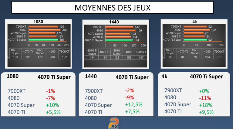 En moyenne (cela reste une moyenne sur nos 10 jeux testés et des différences notables peuvent apparaître selon les jeux, certains jeux étant plus "gourmands" que d'autres), la 4070 Ti Super est plus performante de 5,5 à 9,5% que le modèle précédent et de 10 à 18% plus performante que la carte de gamme inférieure 4070 Super. On note également que la 4070 Ti Super reste moins performante que la 4080 de 7 à 11% selon la résolution. Par rapport à sa concurrente AMD, la 7900 XT, les résultats sont dans un mouchoir de poche : elle est moins performante de 1% en 1080p, de 2% en 1440p et reste à peu près à égalité en 4K. Nous rappelons bien sûr que les résultats peuvent varier selon les jeux et que cela reste une moyenne sur 10 jeux.