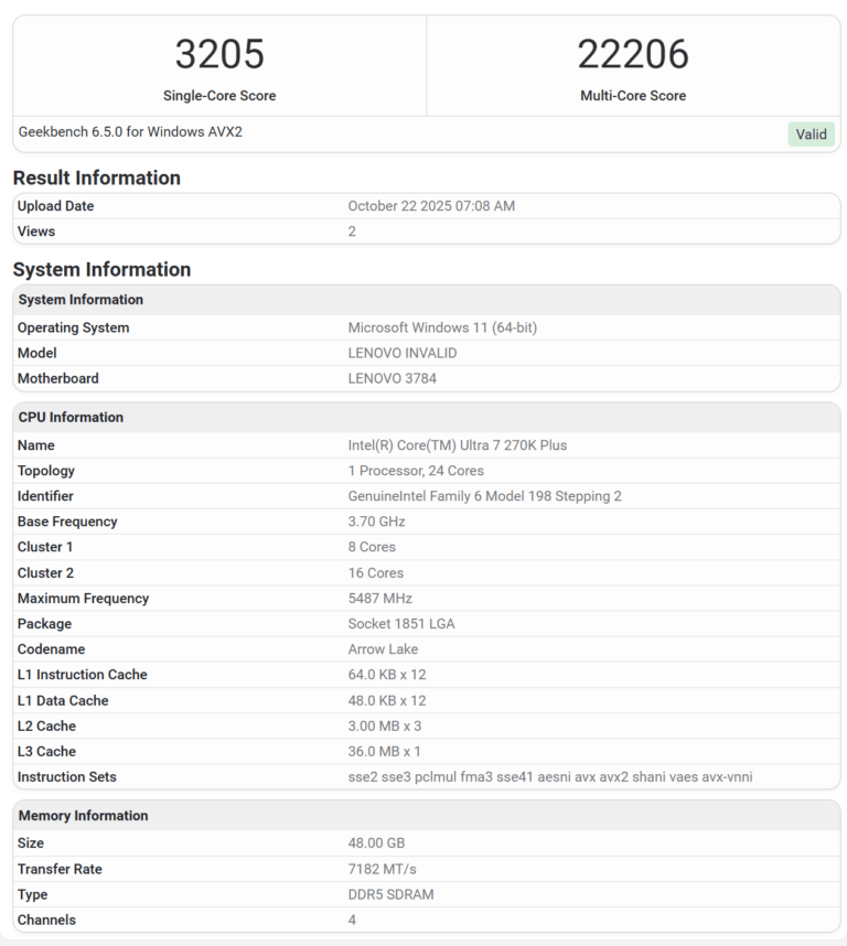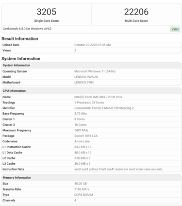 Les fréquences repérées sont les mêmes que celles du Core Ultra 7 265K, soit 3,7 GHz de base et 5,5 GHz en boost, mais le nombre de cœurs passe de 20 à 24. Et d’après les premiers scores Geekbench, les performances seraient déjà au niveau du 285K, avec environ 3215 points en single-core et 22 700 points en multi-core.