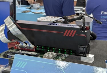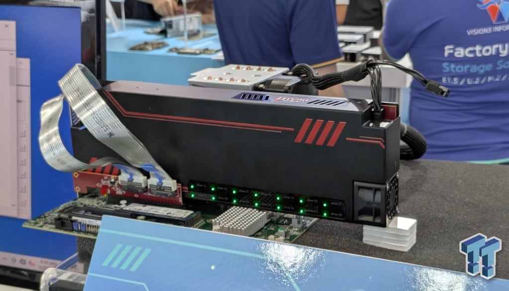 Lors de l'événement, une démonstration précoce a montré un AIC Gen6 refroidi activement installé dans un slot x16 complet, sans SSD Gen6 en fonctionnement (car ces derniers ne sont pas encore disponibles).
